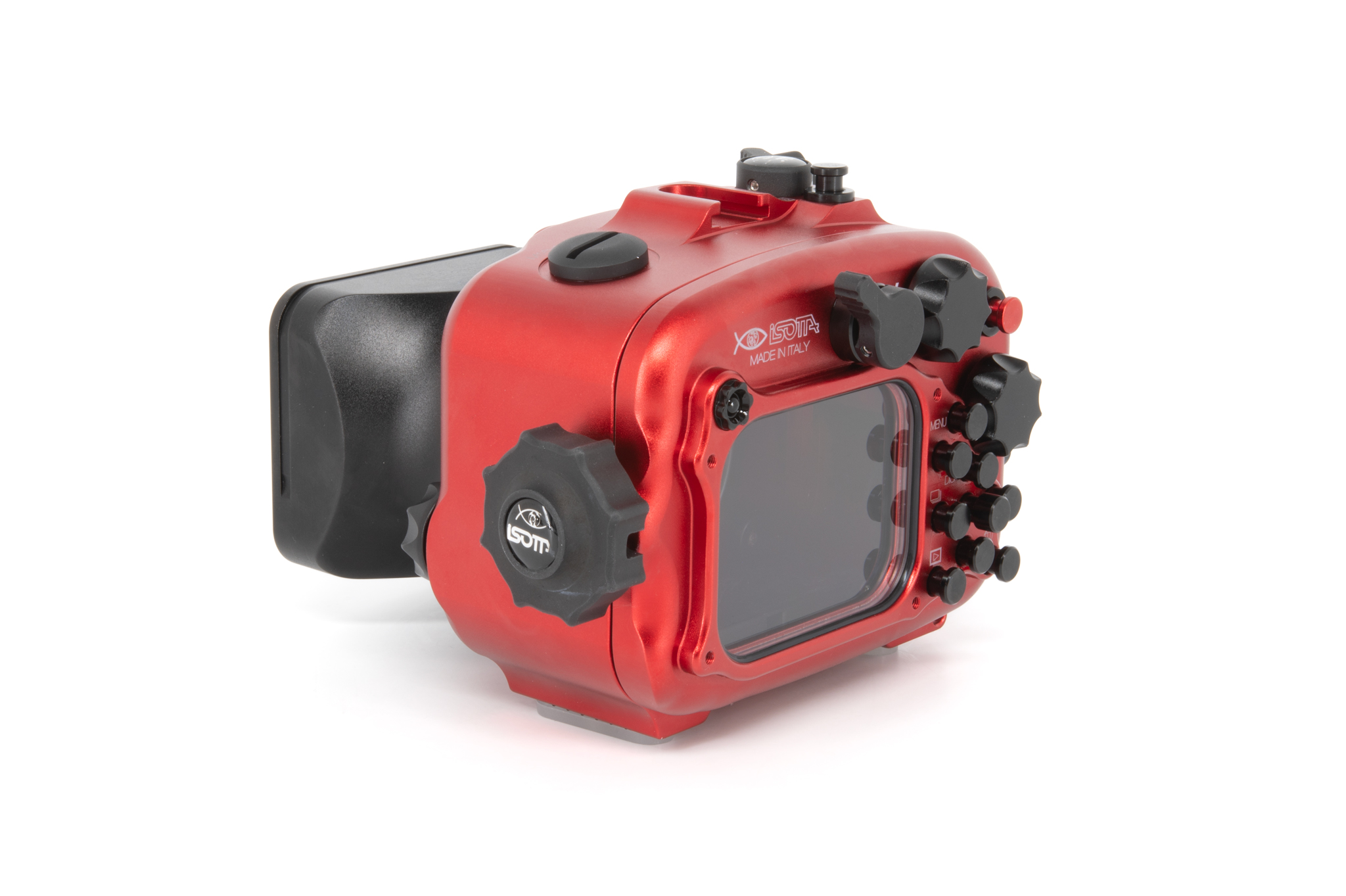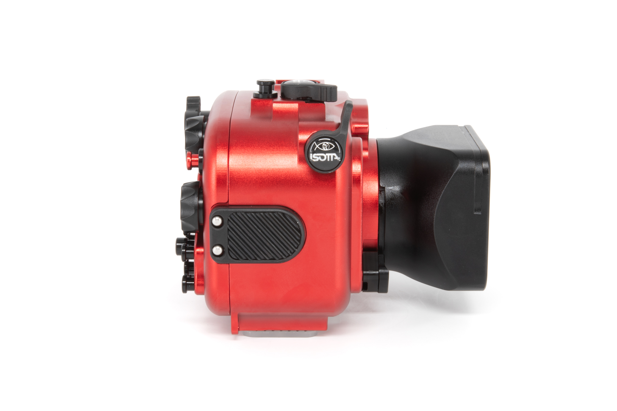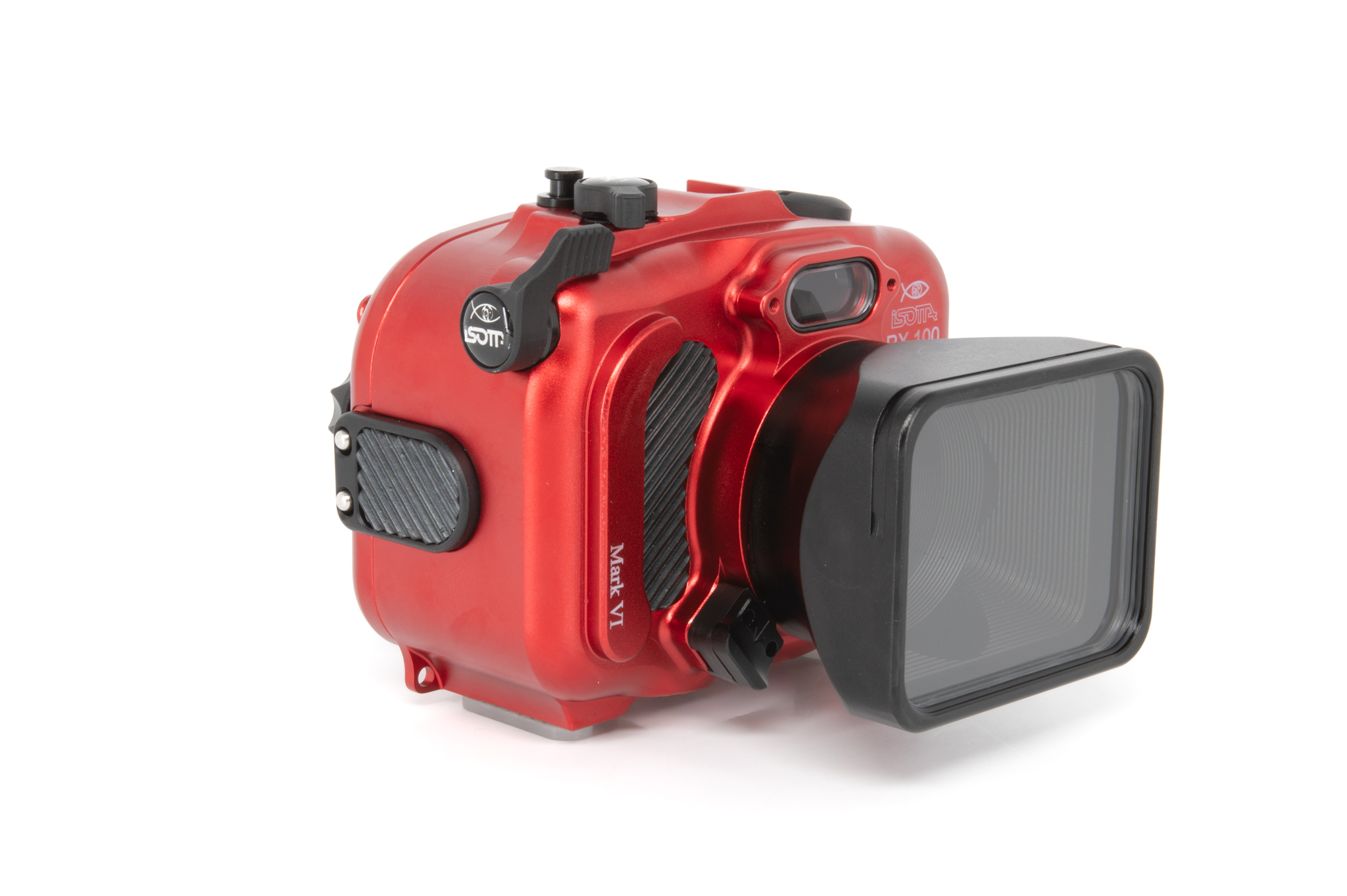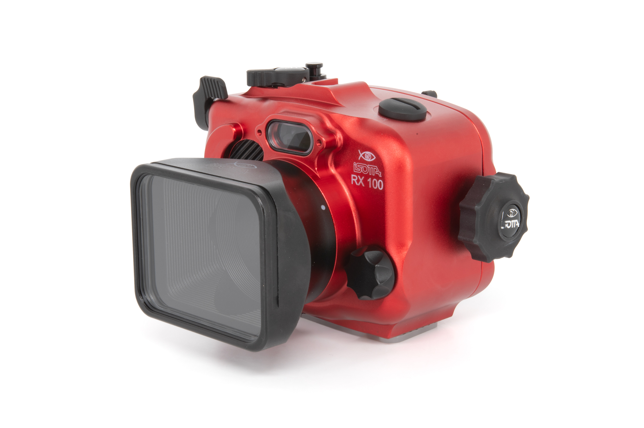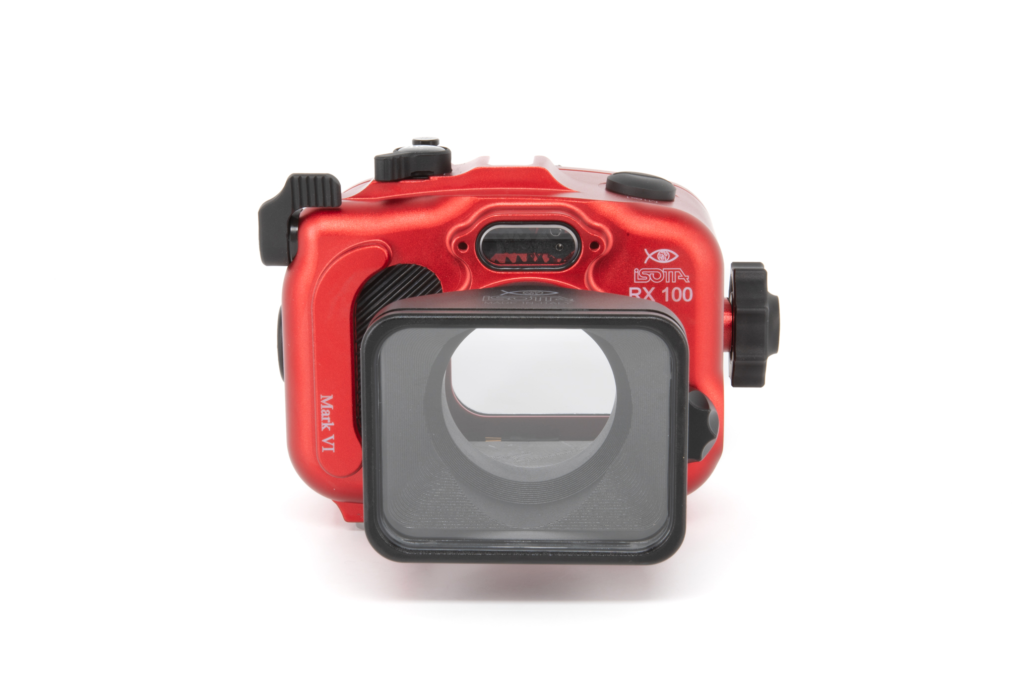 Carcasa profesional de Isotta diseñada específicamente para la cámara Sony RX100 Mark VI. Fabricada en aluminio anodizado de color rojo característico, ofrece un control total sobre todas las funciones de la cámara a profundidades de hasta 100 metros. Cuenta con un diseño ergonómico que permite el manejo con una sola mano mediante su perilla de cierre lateral. La seguridad está garantizada por un sistema de doble junta tórica en cada botón y pieza móvil, además de incluir un sensor de humedad interno con indicador LED. Los controles están claramente grabados con los mismos símbolos que la cámara original para una operación intuitiva bajo el agua.
