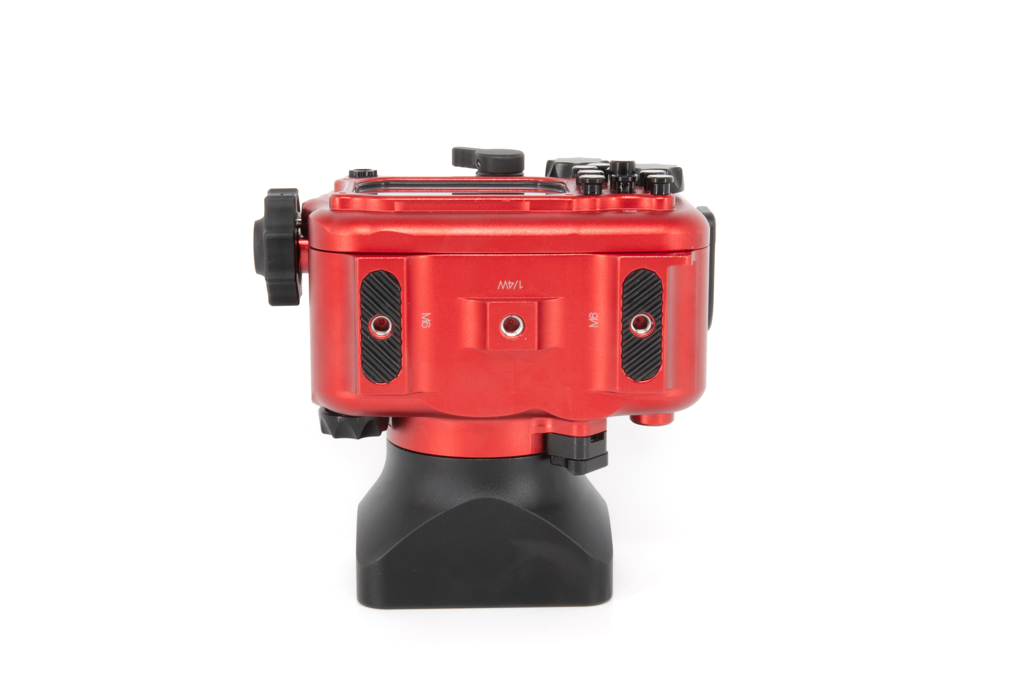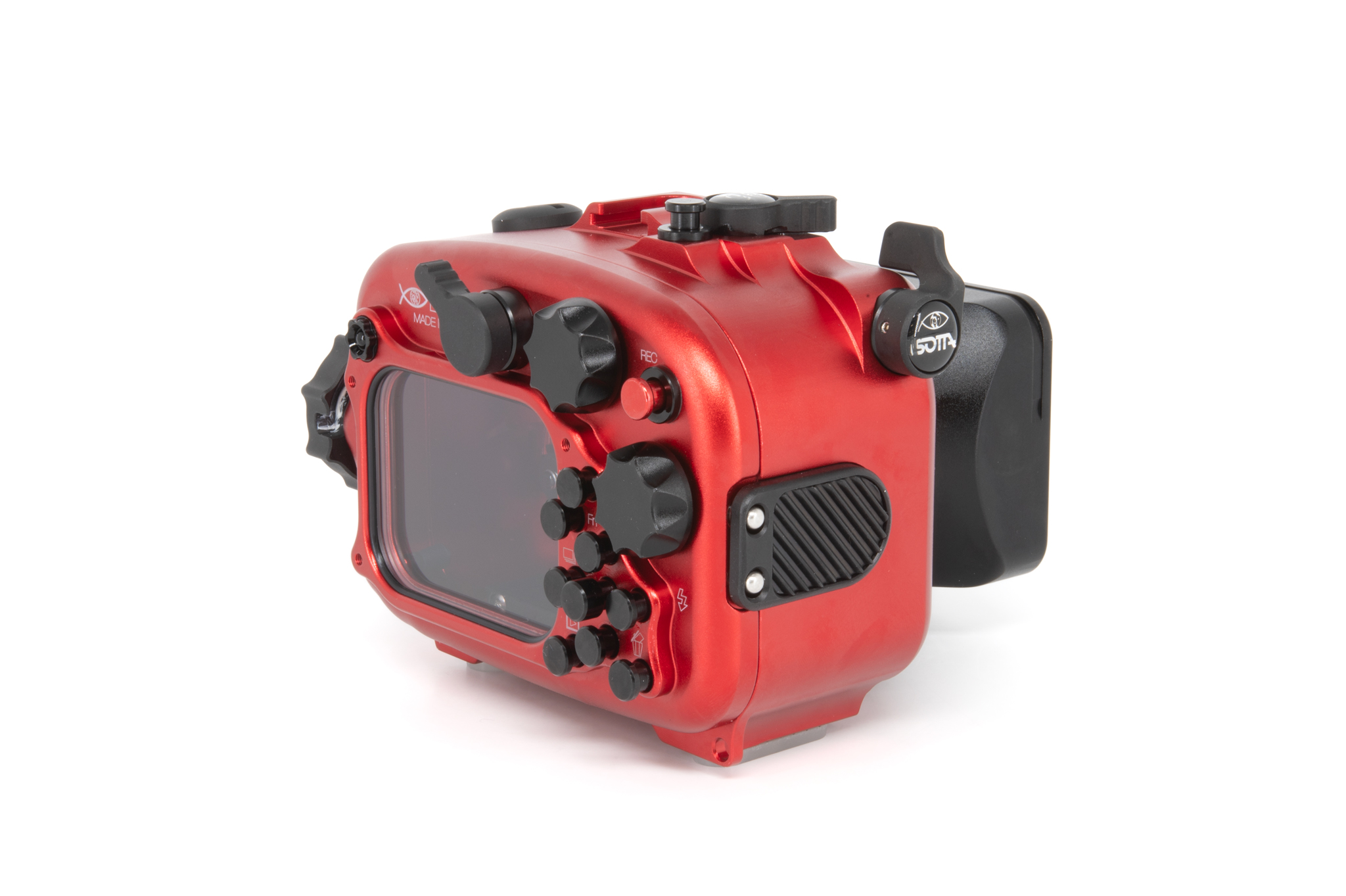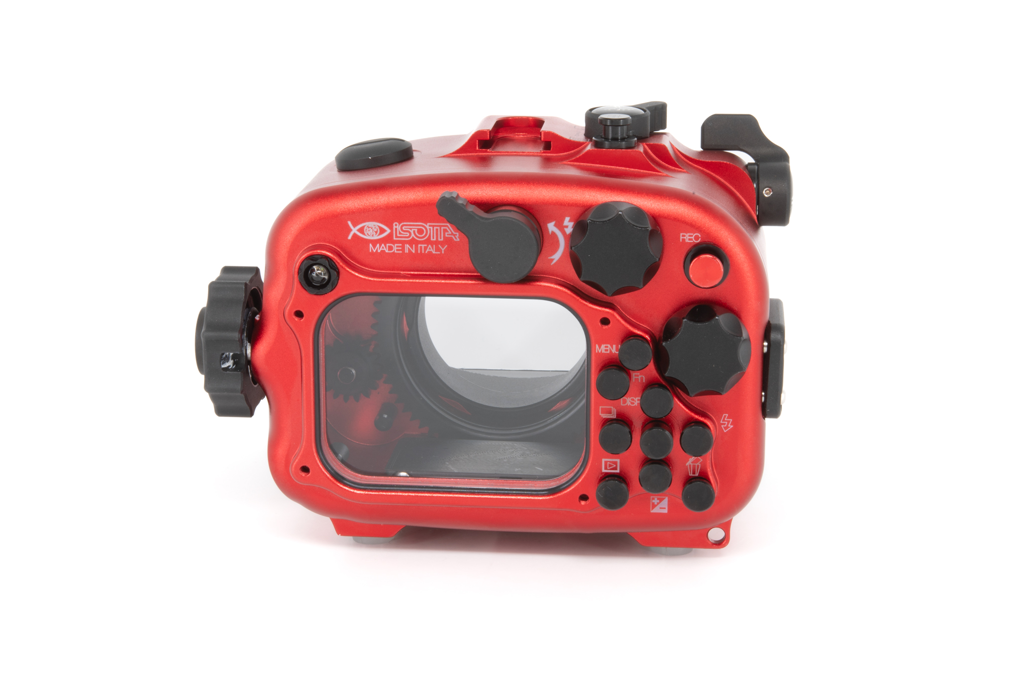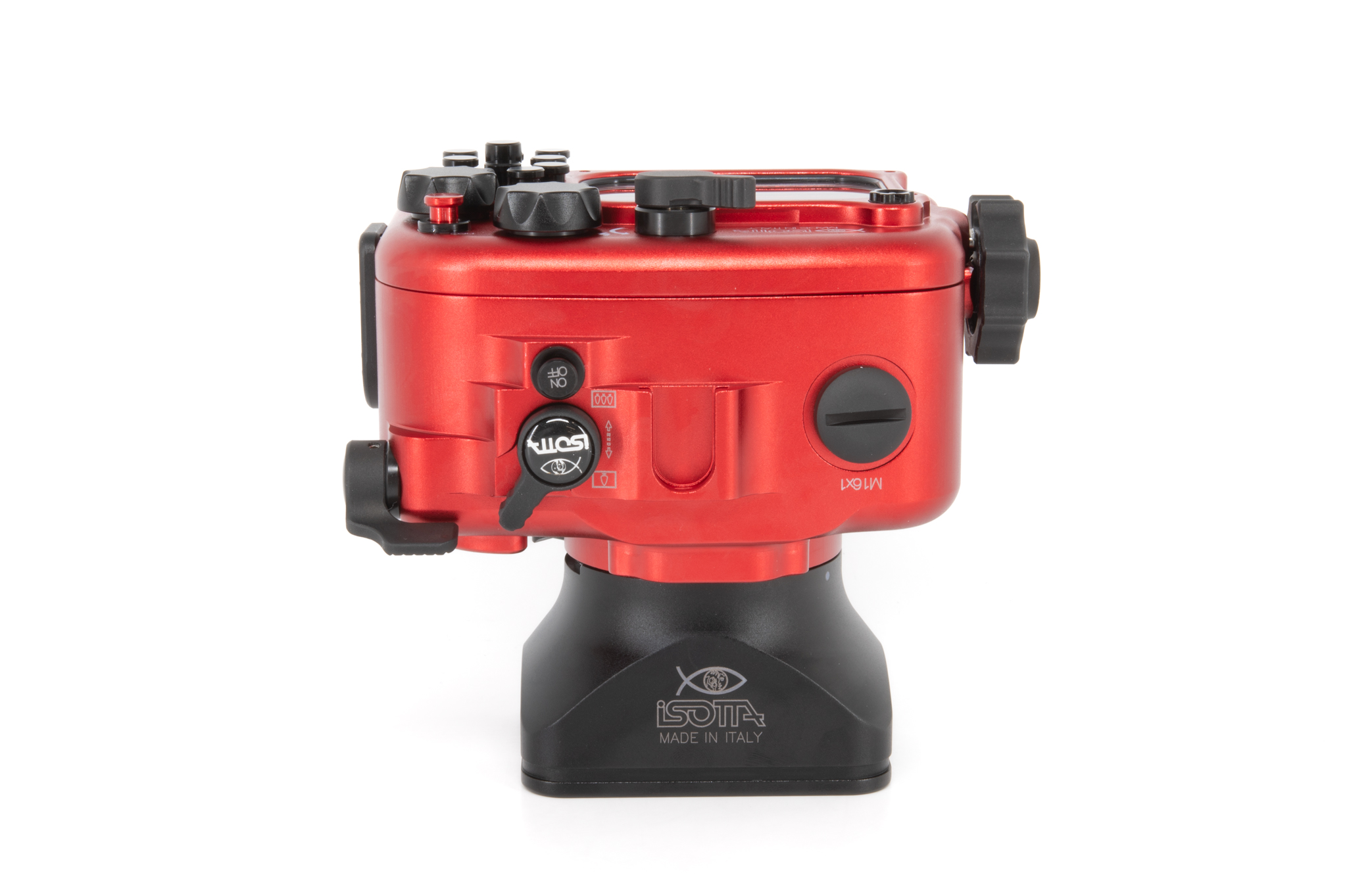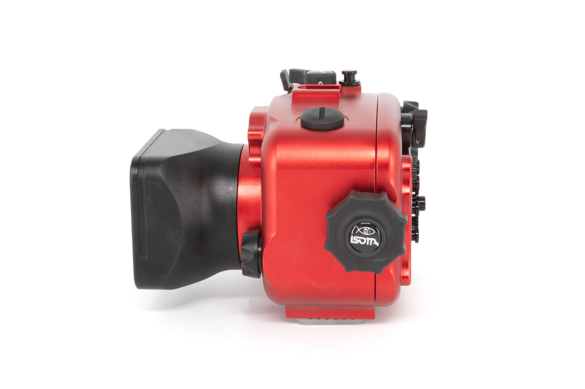 Carcasa profesional de Isotta diseñada específicamente para la cámara Sony RX100 Mark VI. Fabricada en aluminio anodizado de color rojo característico, ofrece un control total sobre todas las funciones de la cámara a profundidades de hasta 100 metros. Cuenta con un diseño ergonómico que permite el manejo con una sola mano mediante su perilla de cierre lateral. La seguridad está garantizada por un sistema de doble junta tórica en cada botón y pieza móvil, además de incluir un sensor de humedad interno con indicador LED. Los controles están claramente grabados con los mismos símbolos que la cámara original para una operación intuitiva bajo el agua.
