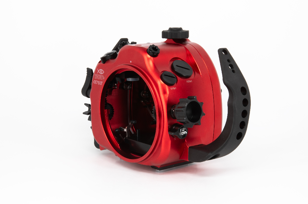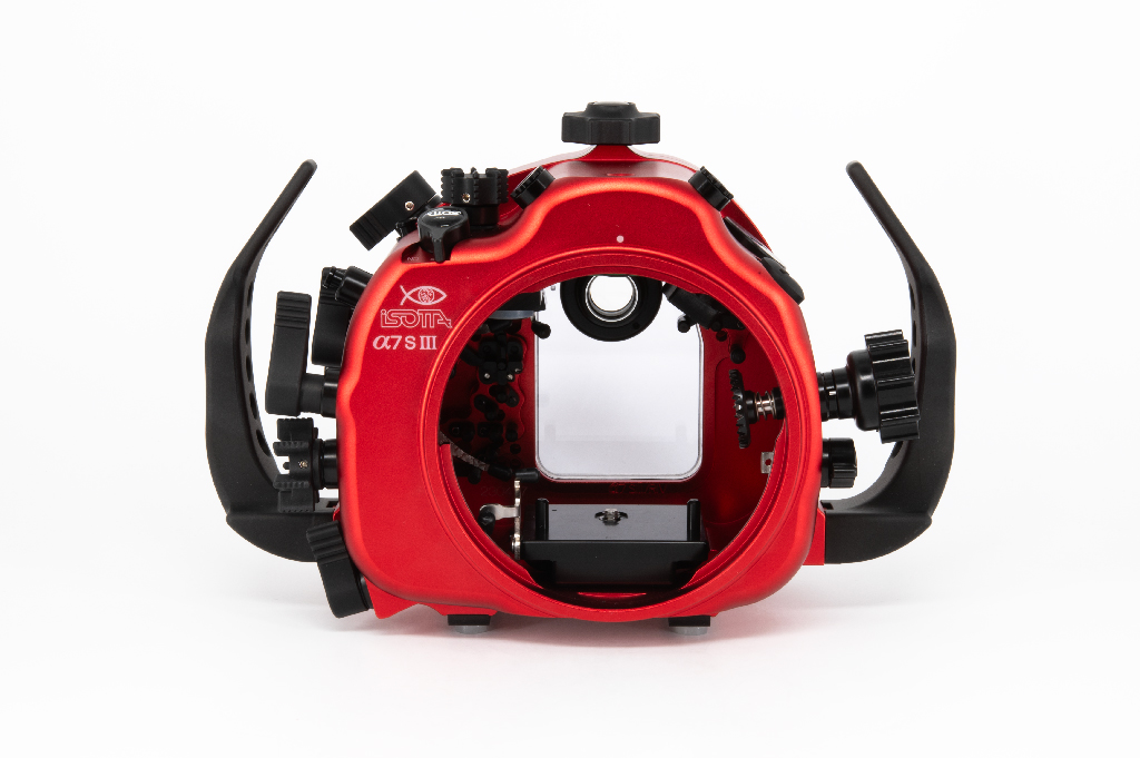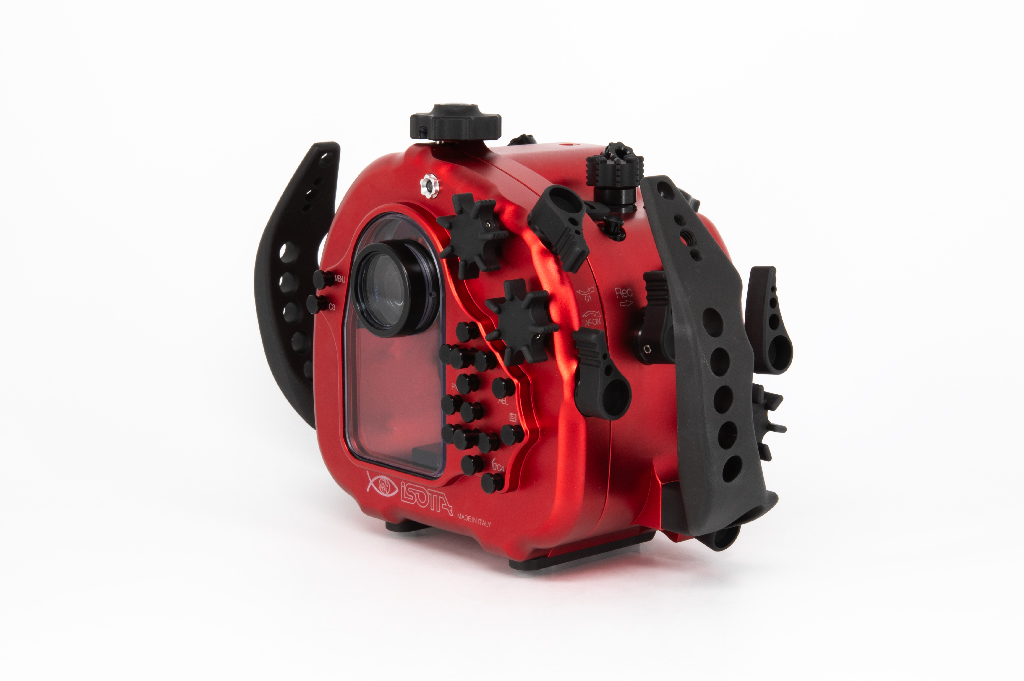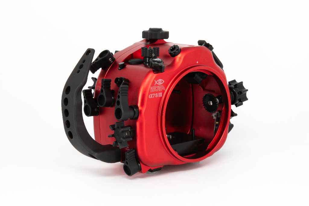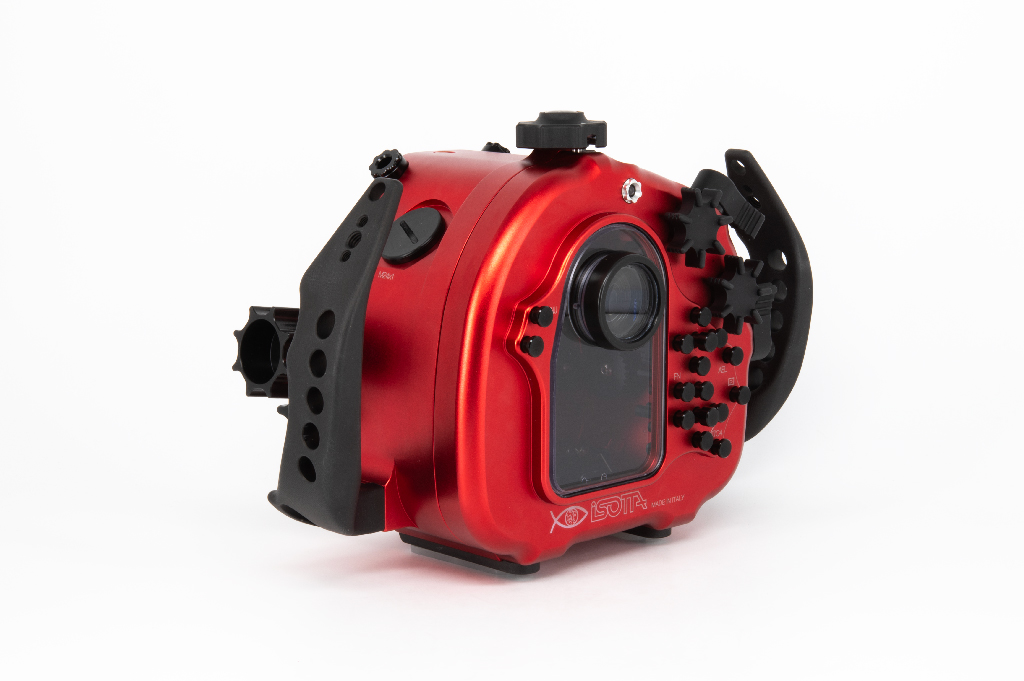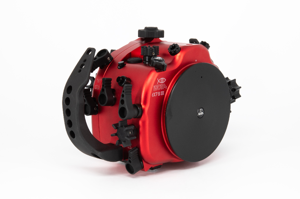 Carcasa submarina profesional de Isotta diseñada específicamente para la cámara Sony Alpha 7S III. Fabricada en aluminio anodizado de alta calidad en color rojo, esta carcasa garantiza durabilidad y resistencia en condiciones extremas. Cuenta con doble junta tórica en todos los botones y piezas móviles para asegurar la estanqueidad hasta los 100 metros de profundidad. Incluye un sensor de humedad con indicador LED reemplazable, mandos ergonómicos de aluminio con símbolos grabados idénticos a los de la cámara y un sistema de cierre con una sola mano. La carcasa ofrece múltiples opciones de expansión mediante tres orificios M16 y uno M24 para sistemas de vacío, monitores externos o conectores tipo Nikonos/S6. Dimensiones: 282mm x 186mm x 127mm.