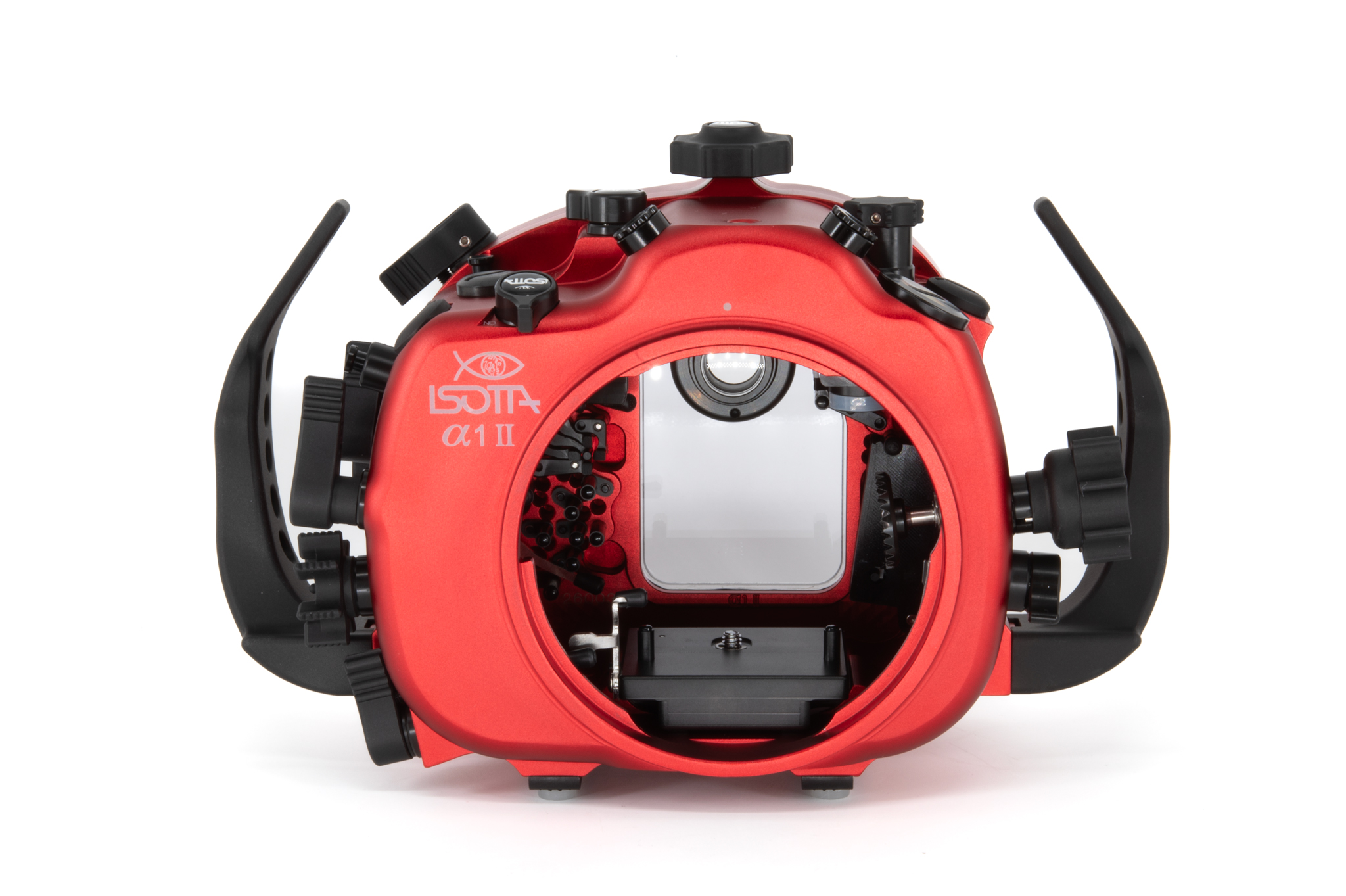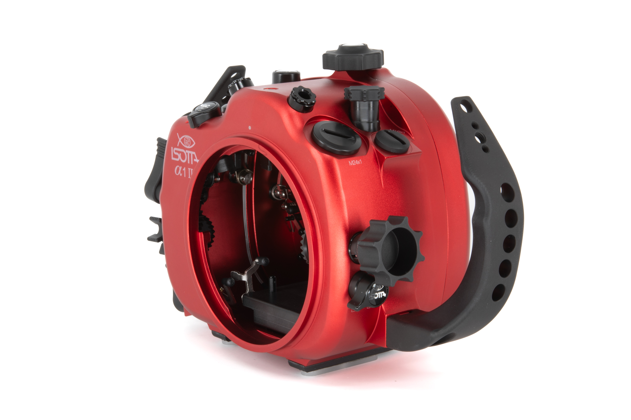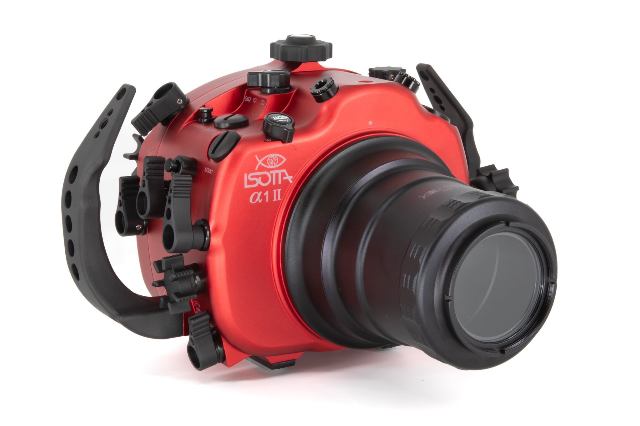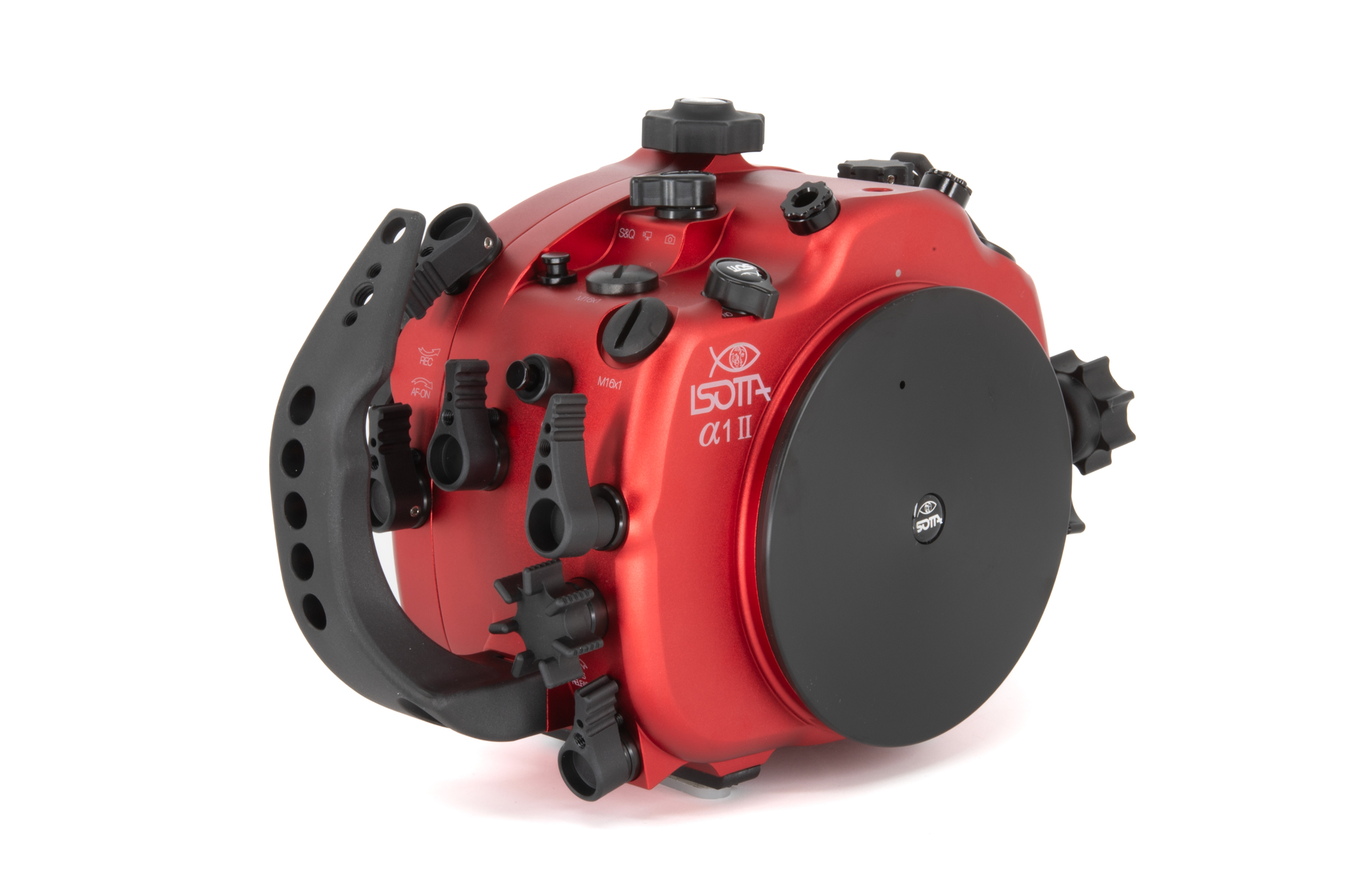 Carcasa submarina profesional de aluminio anodizado en color rojo diseñada específicamente para la cámara Sony Alpha1 II. Cuenta con un diseño ergonómico con mandos y botones de aluminio grabados con símbolos idénticos a los de la cámara. Especificaciones técnicas: Cuerpo de aluminio de alta resistencia, doble junta tórica (O-ring) en todos los controles, sensor de humedad integrado con indicador LED, y sistema de cierre con perilla de una sola mano. Soporta una profundidad de trabajo de hasta 100 metros. Incluye una bayoneta extraíble B120 con bloqueo de seguridad para puertos. Dimensiones: 291 x 187 x 130,5 mm. Peso en aire: 2,6 kg. El paquete incluye la carcasa, tapas protectoras, sensor de humedad, kit de juntas tóricas de repuesto y grasa de silicona.