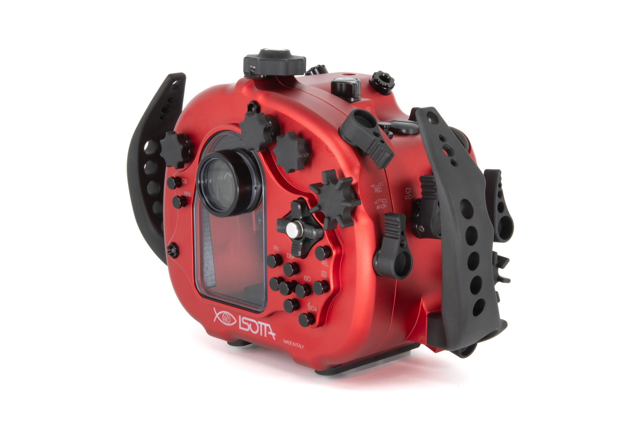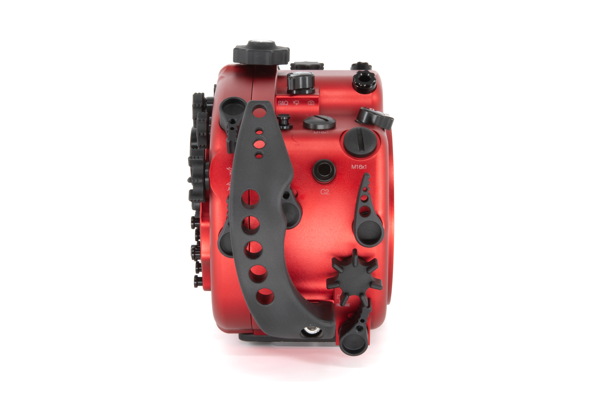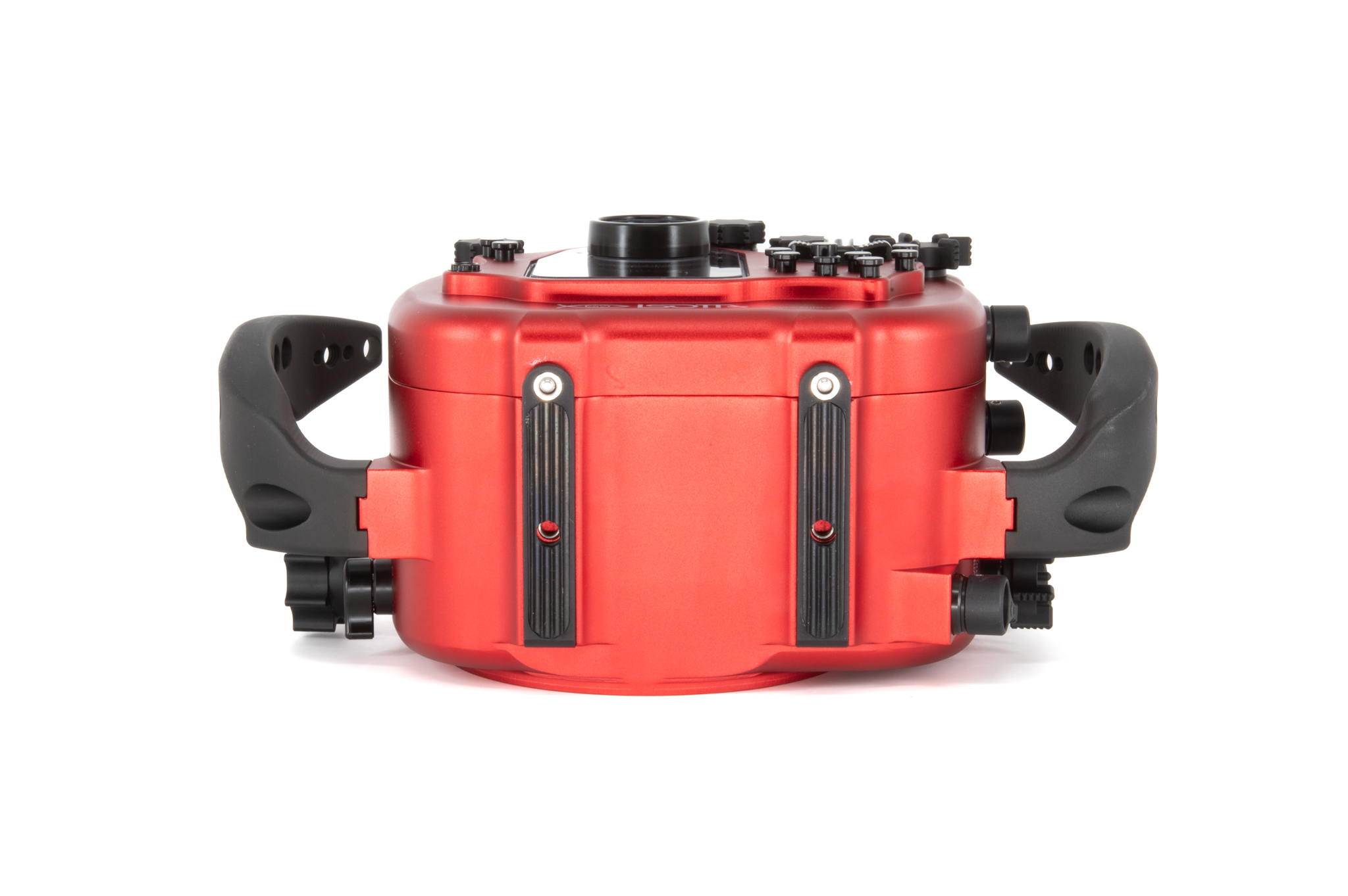 Carcasa submarina profesional de aluminio anodizado en color rojo diseñada específicamente para la cámara Sony Alpha1 II. Cuenta con un diseño ergonómico con mandos y botones de aluminio grabados con símbolos idénticos a los de la cámara. Especificaciones técnicas: Cuerpo de aluminio de alta resistencia, doble junta tórica (O-ring) en todos los controles, sensor de humedad integrado con indicador LED, y sistema de cierre con perilla de una sola mano. Soporta una profundidad de trabajo de hasta 100 metros. Incluye una bayoneta extraíble B120 con bloqueo de seguridad para puertos. Dimensiones: 291 x 187 x 130,5 mm. Peso en aire: 2,6 kg. El paquete incluye la carcasa, tapas protectoras, sensor de humedad, kit de juntas tóricas de repuesto y grasa de silicona.