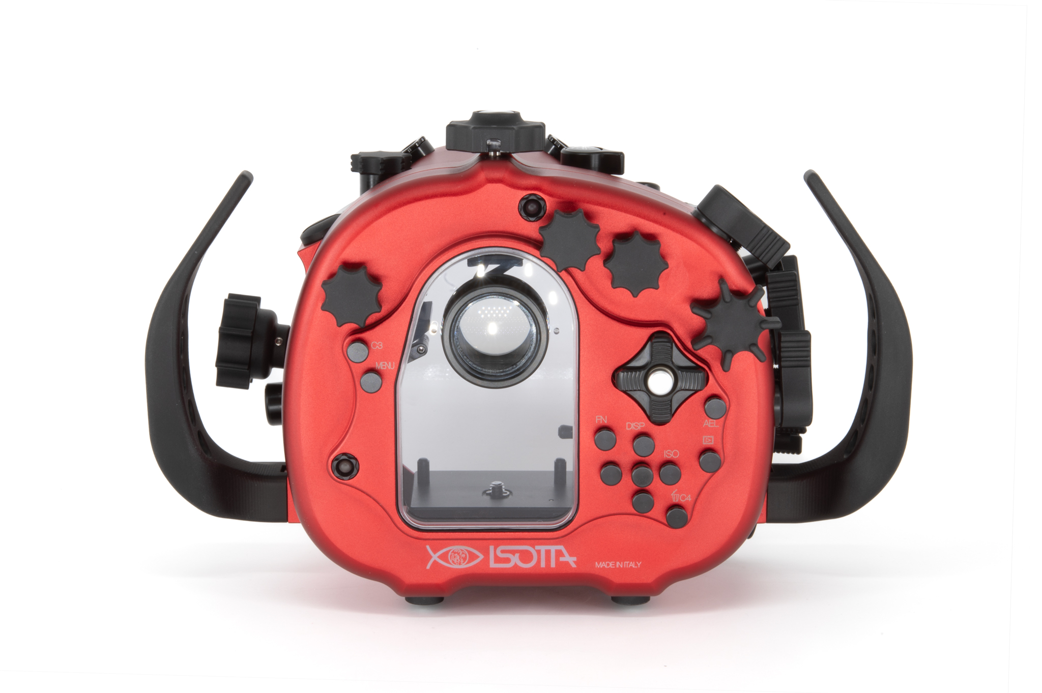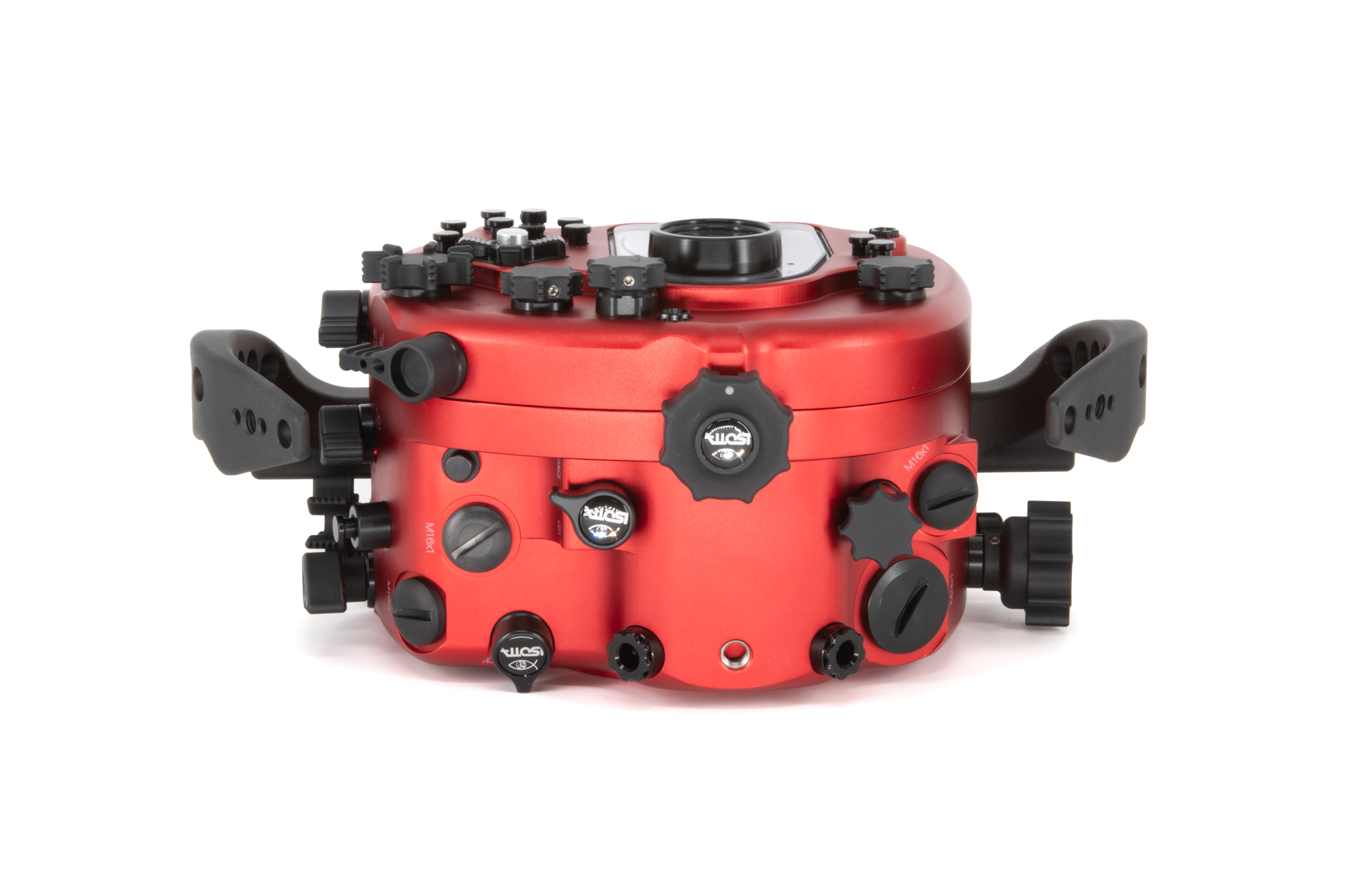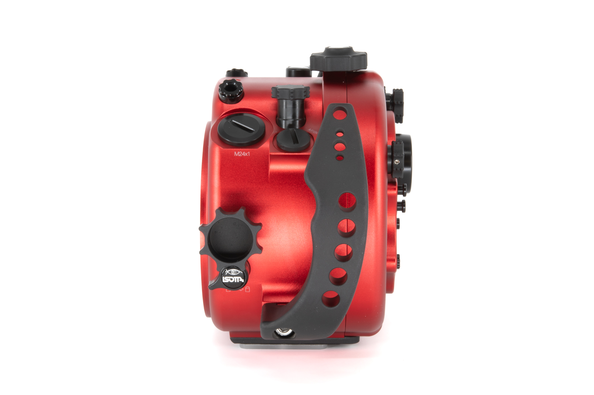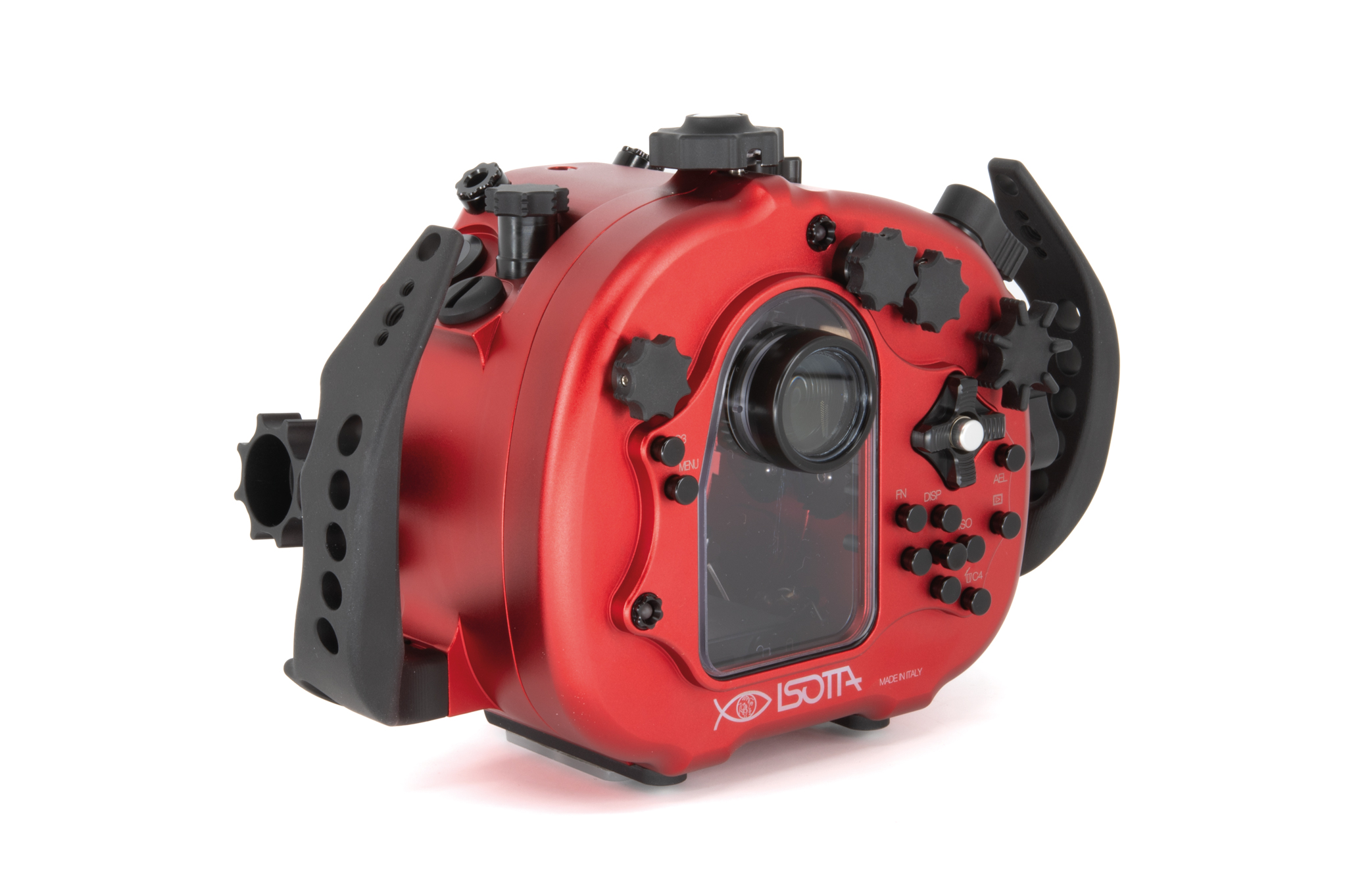 Carcasa submarina profesional de aluminio anodizado en color rojo diseñada específicamente para la cámara Sony Alpha1 II. Cuenta con un diseño ergonómico con mandos y botones de aluminio grabados con símbolos idénticos a los de la cámara. Especificaciones técnicas: Cuerpo de aluminio de alta resistencia, doble junta tórica (O-ring) en todos los controles, sensor de humedad integrado con indicador LED, y sistema de cierre con perilla de una sola mano. Soporta una profundidad de trabajo de hasta 100 metros. Incluye una bayoneta extraíble B120 con bloqueo de seguridad para puertos. Dimensiones: 291 x 187 x 130,5 mm. Peso en aire: 2,6 kg. El paquete incluye la carcasa, tapas protectoras, sensor de humedad, kit de juntas tóricas de repuesto y grasa de silicona.