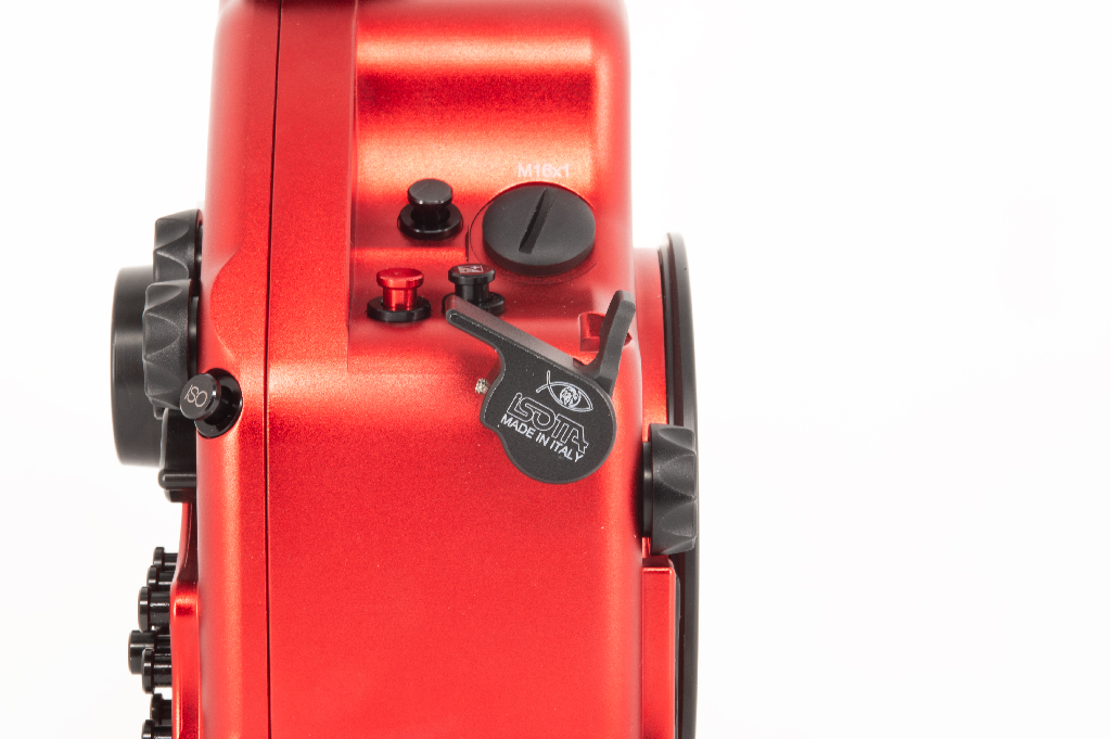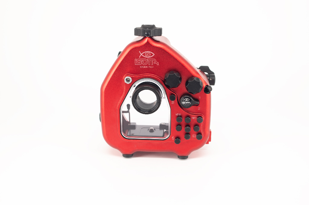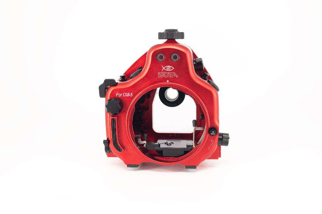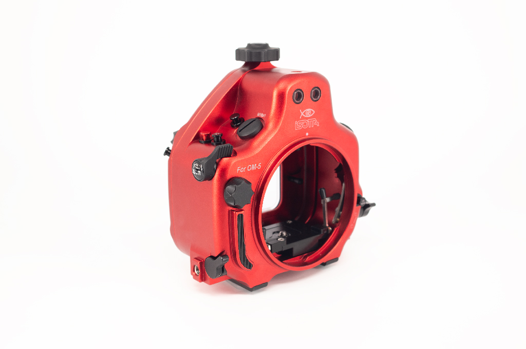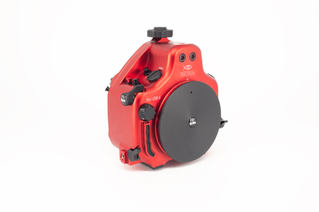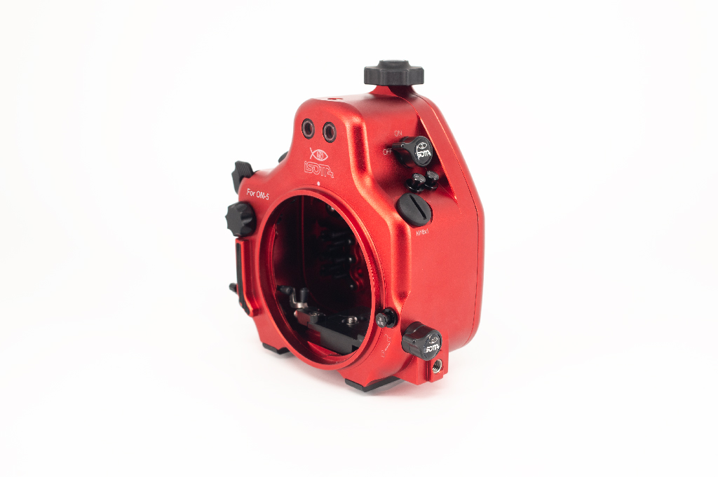 Carcasa submarina profesional de Isotta diseñada específicamente para la cámara OM System OM-5. Fabricada en aluminio anodizado de alta calidad en color rojo distintivo, ofrece una resistencia excepcional y durabilidad bajo el agua hasta una profundidad de 100 metros. Cuenta con un diseño ergonómico con botones y diales de aluminio que replican los controles de la cámara con símbolos grabados. Incluye un sistema de cierre de seguridad con una sola mano, doble junta tórica en todas las partes móviles, sensor de humedad con indicador LED y montura de bayoneta B102 para puertos. Las especificaciones técnicas incluyen dimensiones de 178mm x 189mm x 106mm y conexiones de fibra óptica de serie. Nota: Las empuñaduras laterales no están incluidas.