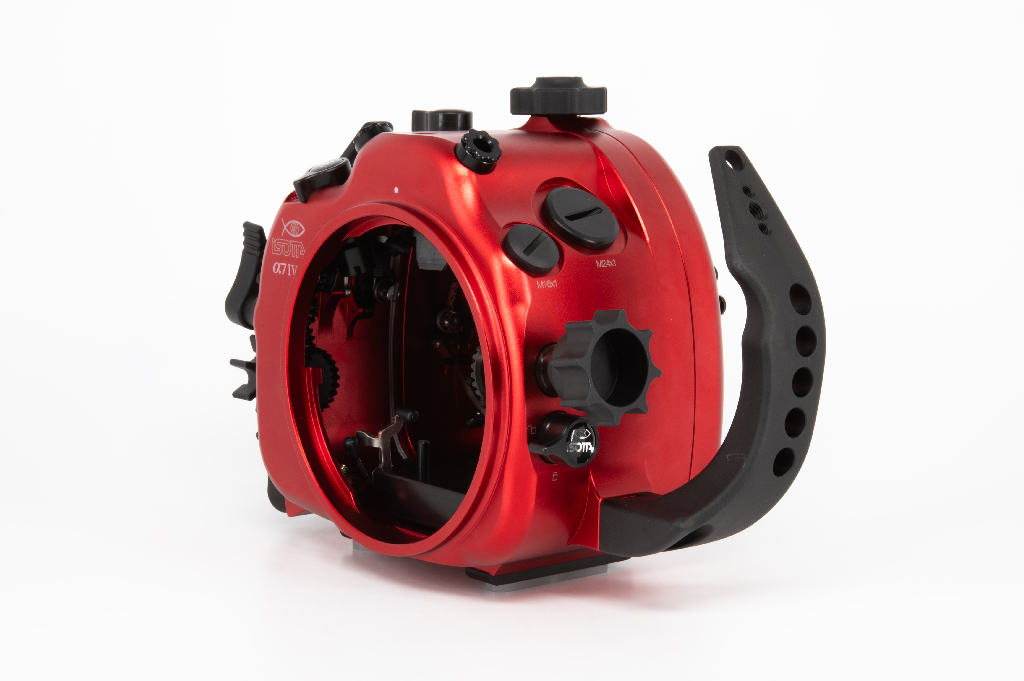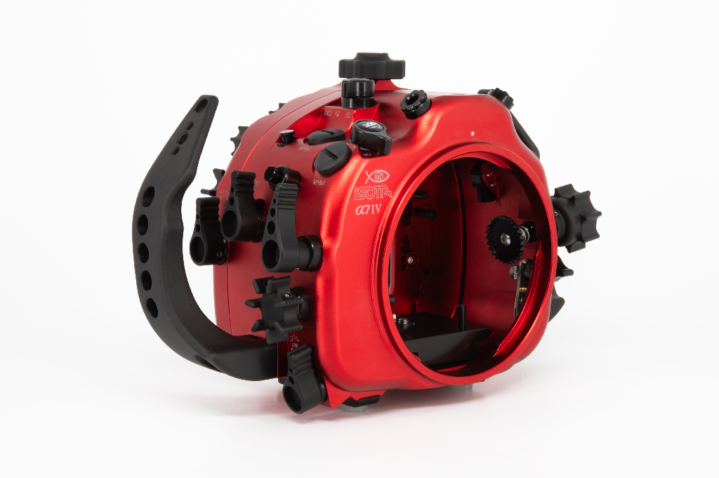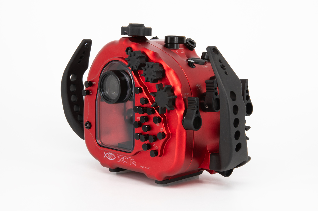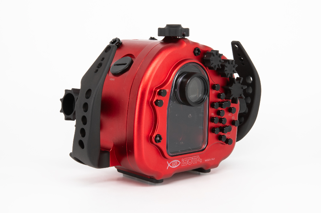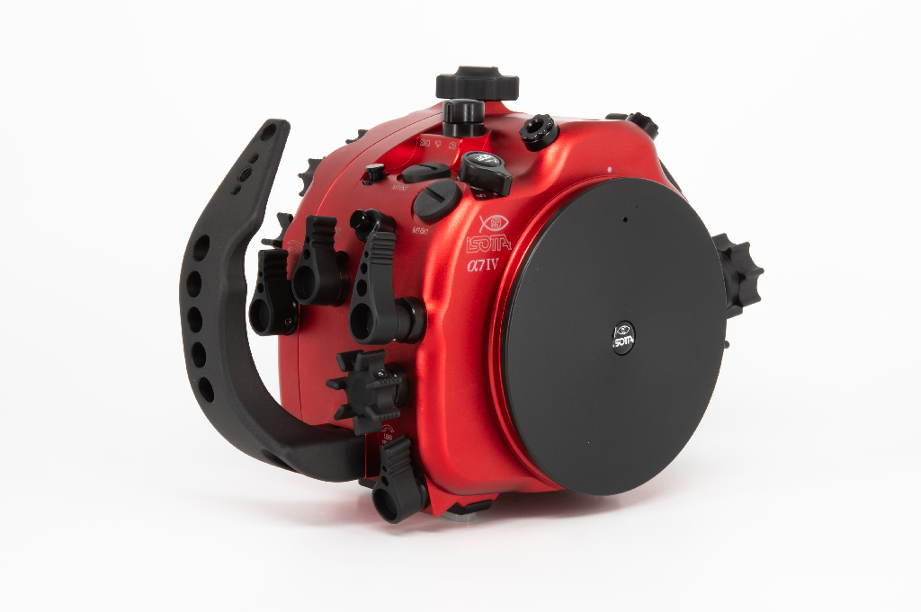 Carcasa profesional Isotta fabricada en aluminio anodizado de color rojo diseñada específicamente para la cámara Sony Alpha 7 IV. Esta carcasa destaca por su robustez y ergonomía, permitiendo operar a profundidades de hasta 100 metros.