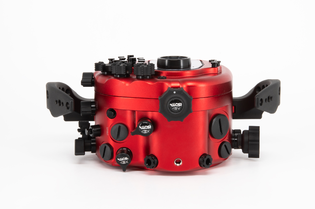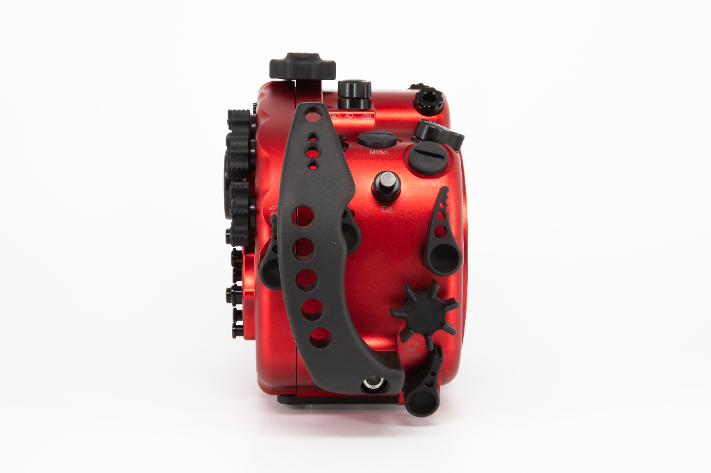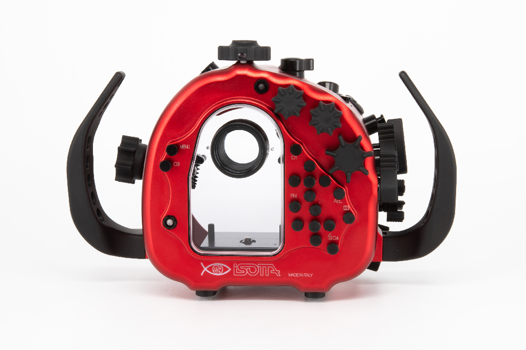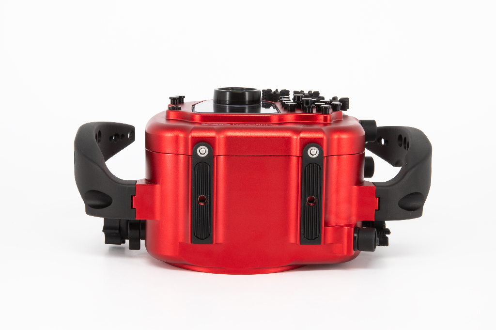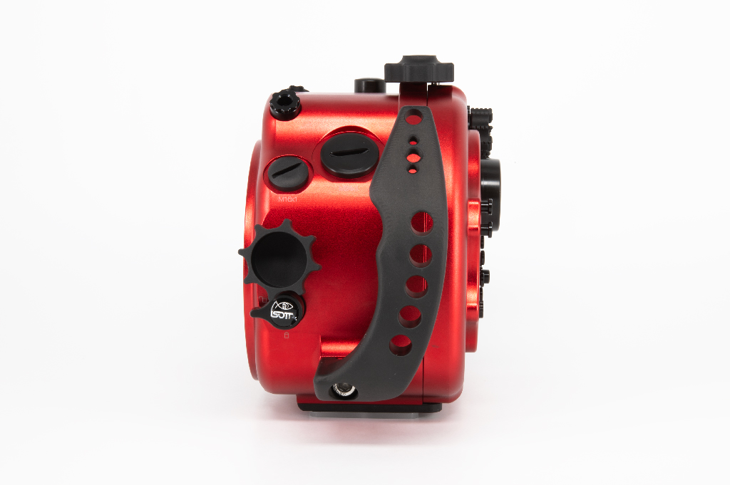 Carcasa profesional Isotta fabricada en aluminio anodizado de color rojo diseñada específicamente para la cámara Sony Alpha 7 IV. Esta carcasa destaca por su robustez y ergonomía, permitiendo operar a profundidades de hasta 100 metros.