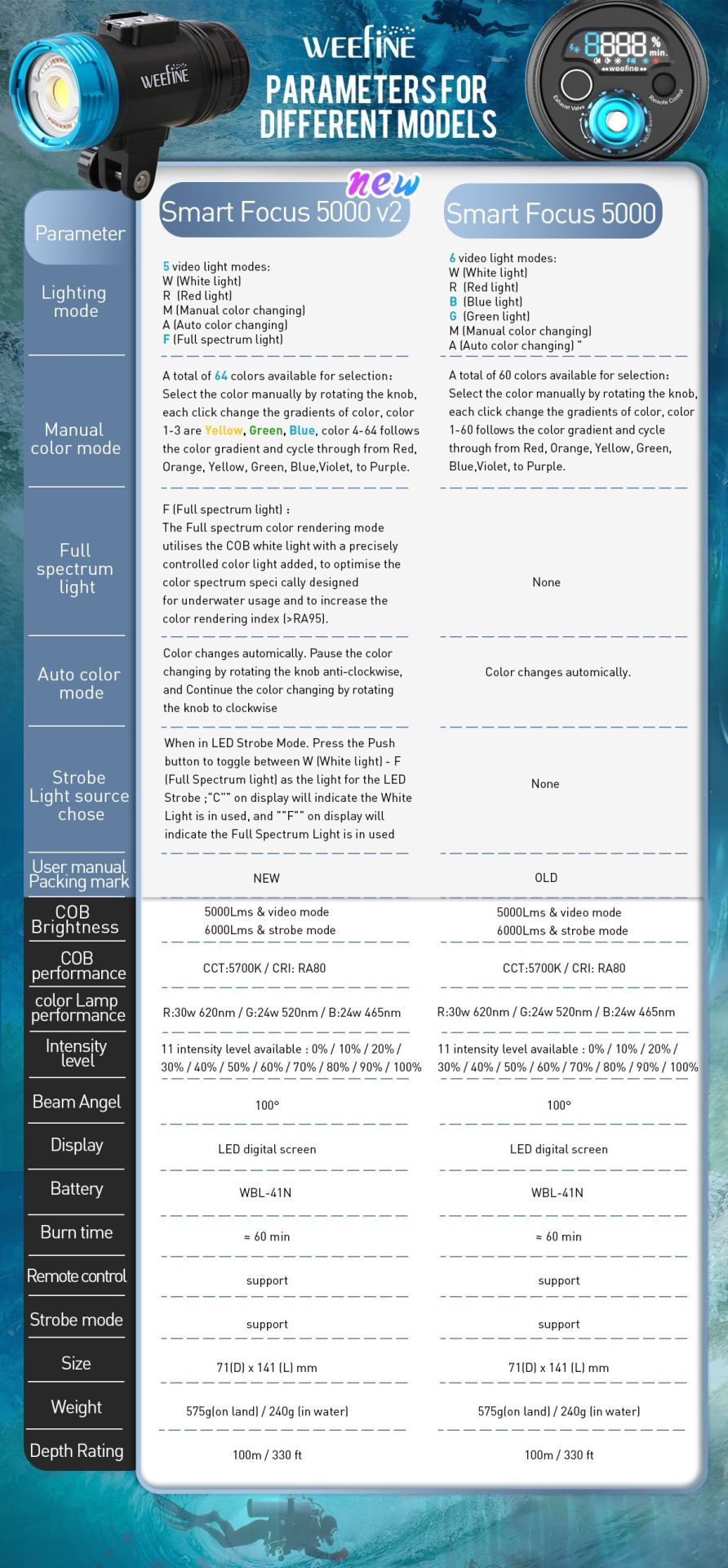 Foco dual de Weefine, se puede usar cómo haz de vídeo o cómo flash al poder conectarlo con tu cámara mediante un cable de fibra óptica. Smart Focus 5000 le ofrece 5000 lúmenes en modo vídeo con 11 niveles de potencia en color blanco y en multicolor y 6000 lúmenes en modo flash. 5 Colores de uso: Blanco, Rojo, Manual, Automático, Spectro completo. Nos permite ajustar la tonalidad hasta en 64 tonos de color. Con el haz de vídeo a máxima potencia tenemos 60 minutos de luz y puede durar hasta 10 horas al 3% de potencia. En el modo flash tenemos hasta 10 horas de uso y 10 niveles de ajuste de potencia de salida. Durante todo el tiempo de uso dispondremos de la información de la potencia que estamos usando y del tiempo de batería que nos queda. Además, el modo de luz continua se puede utilizar para enfocar y configurar Auto-Off durante 0,5 segundos cuando se dispara en modo Flash. Nuevo sistema de protección térmica, si el foco supera los 50º se establece un modo de protección dejando el foco al 20% de su potencia para evitar sobre calentamientos.